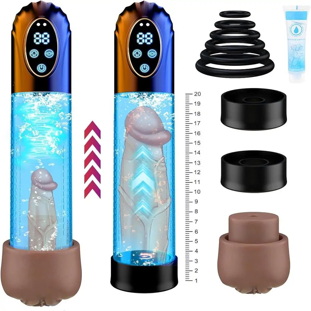 The penis pump generates a vacuum pressure that expands spongy blood vessels, enhancing blood flow and enlarging the penis. It is accompanied by a lifelike pocket pussy for added stimulation. The device is equipped with various suction and erection modes, catering to individuals of all skill levels. The transparent tube displays scale markings, allowing the user to track progress and gain muscle memory to sustain a larger, stronger erection.